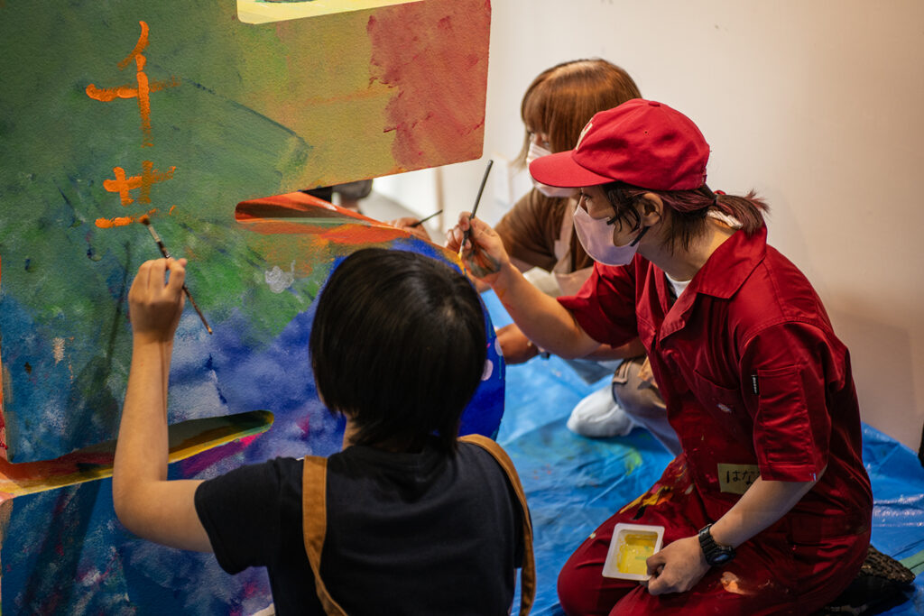 施設に通う利用者様、一人ひとりが、「絵描きやさん♪」と口ずさみながら、自分の好きなイラストや色、手法で大きな「ち」のキャンバスを彩っていきました。